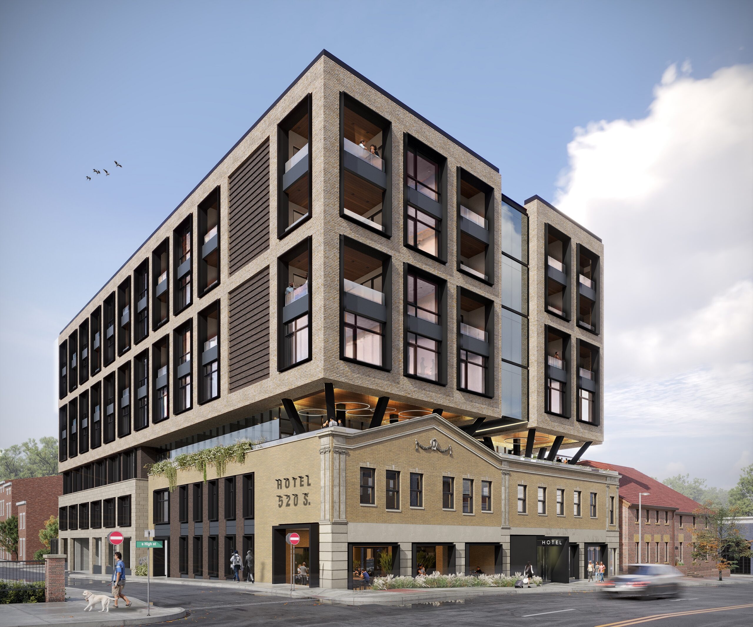 This mixed use development brings a much needed hotel and housing option to a popular area. A seven-story addition is planned to an existing historic structure, adding 122,228 square feet. A new subgrade parking garage will add 42 of parking stalls as well as residential storage and back of house access. The first floor will house separate lobbies for the hotel and condo residents, as well as additional parking and three townhomes. Floors two through four are dedicated to the boutique hotel guest rooms, totaling 62. Floors five through seven offer a mix of one and two bedroom condos, totaling 39. Extensive attention has been given to the façade planning to create an addition that honors the history of the district with a modern interpretation.